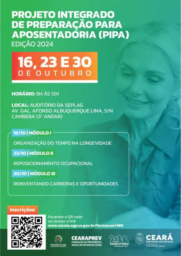 O Governo do Ceará, por meio da Secretaria do Planejamento e Gestão (Seplag), está com inscrições abertas para a edição 2024 do Projeto Integrado de Preparação para Aposentadoria (Pipa), destinado aos servidores aptos à aposentadoria. As palestras presenciais ocorrerão nos dias 16, 23 e 30 de outubro, de 8 às 12 horas, no auditório da Seplag. Para participar é preciso efetuar a inscrição pelo sistema EGPCE Virtual.