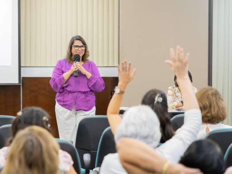 Ao longo da sua apresentação, a palestrante Dulce Ane Lucena convidou os participantes a olharem para si no mundo do trabalho e na vida e a refletirem sobre questões como a sua trajetória no serviço público, as expectativas em relação à instituição e ao trabalho, a necessidade de se reposicionar e o desafio de assumir um novo posicionamento.